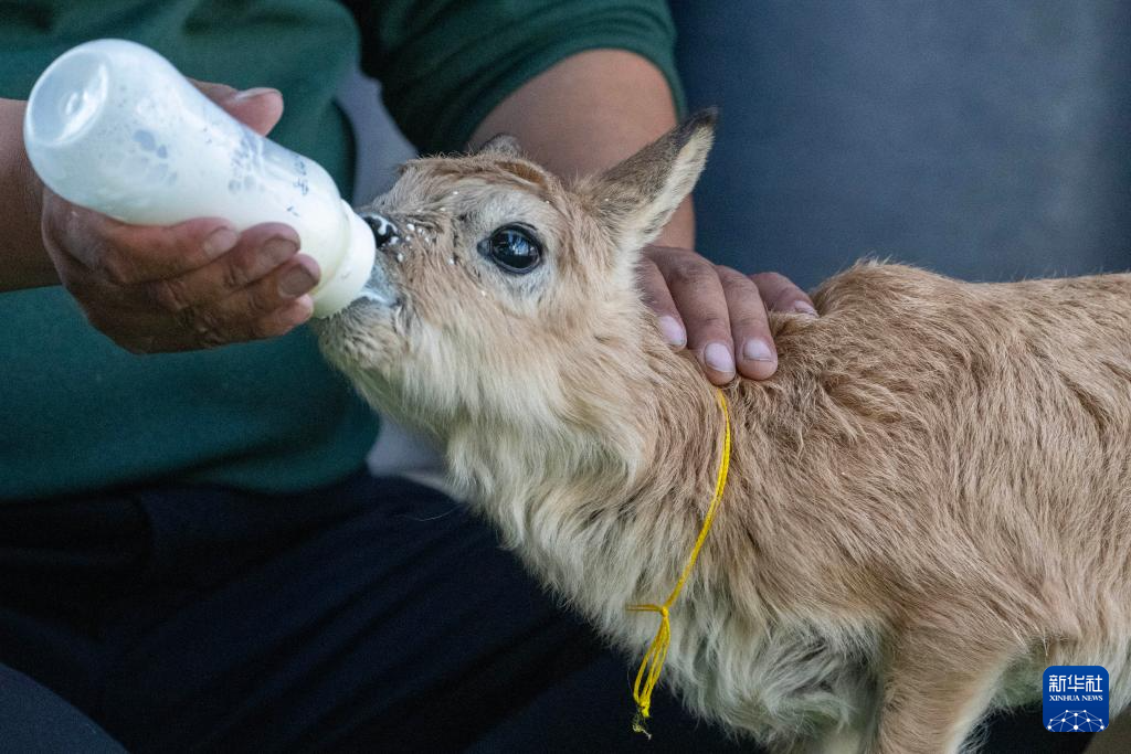 措罗木管理站站长阿旺洛卓在给藏羚羊幼崽喂奶(7月16日摄)。
