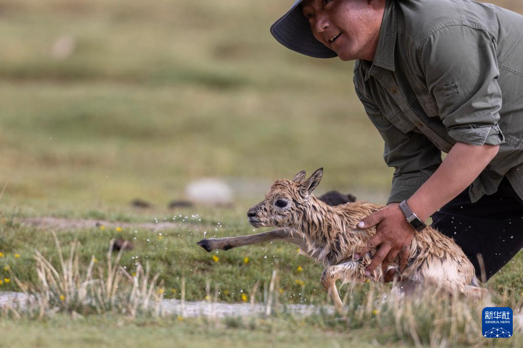 管护队员次旺在救助一只被激流冲走的藏羚羊幼崽(7月14日摄)。
