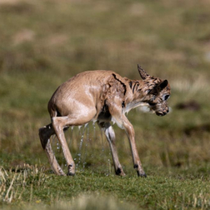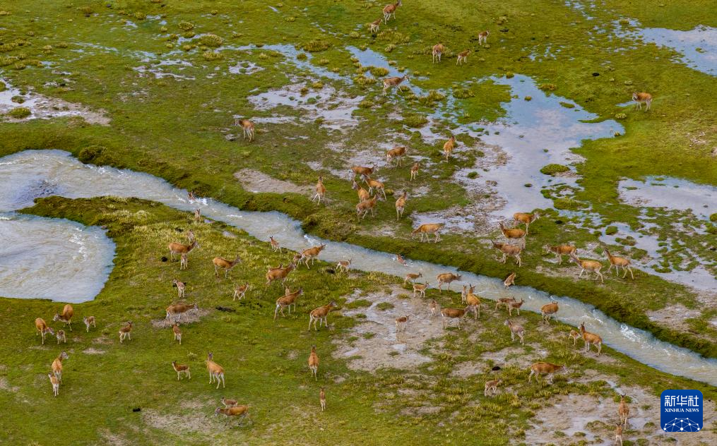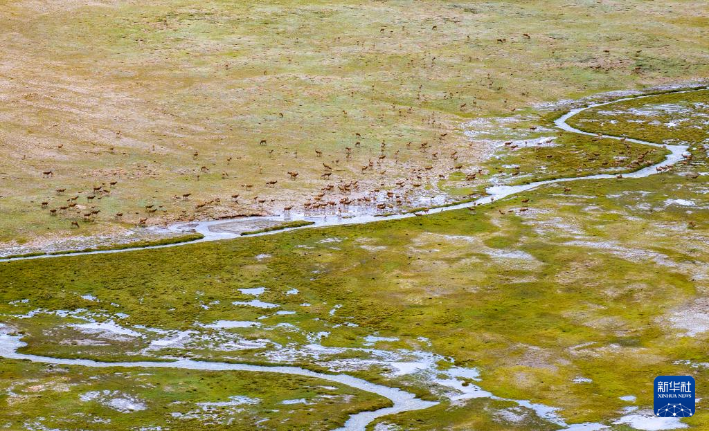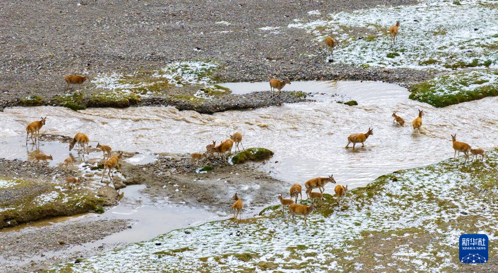 一群带着幼崽的藏羚羊成功渡过森隆藏布河,幼崽身上水迹未干(7月15日摄)。