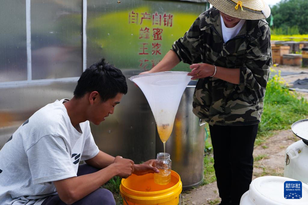 7月16日,在青海省海北藏族自治州门源回族自治县,廖春容与吴昊过滤新鲜蜂蜜。