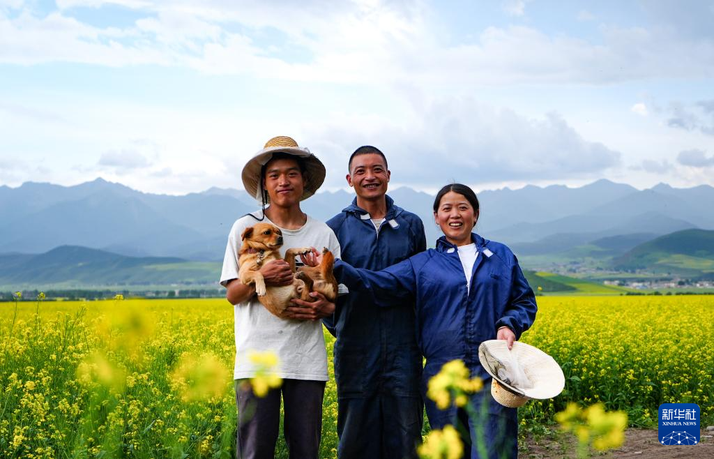 这是摄于青海省海北藏族自治州门源回族自治县花田的吴凤明一家(7月16日摄)。