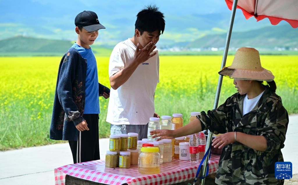 7月16日,在青海省海北藏族自治州门源回族自治县,游客在吴凤明家蜂蜜摊前品尝蜂蜜。