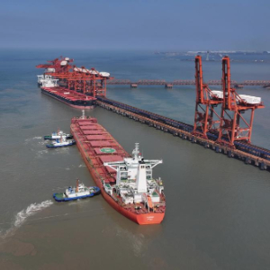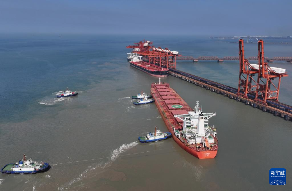 7月18日,轮船在拖轮的协助下向唐山港曹妃甸港区矿石码头靠泊(无人机照片)。