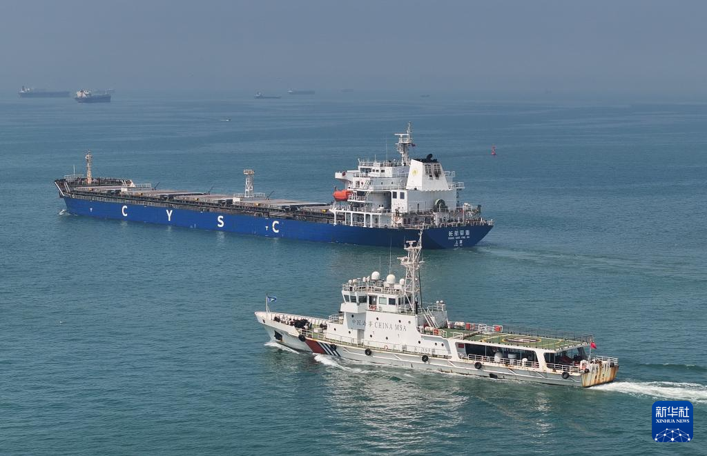 7月18日,曹妃甸海事局的巡逻船(前)在唐山港曹妃甸港区海域为进出港轮船护航(无人机照片)。