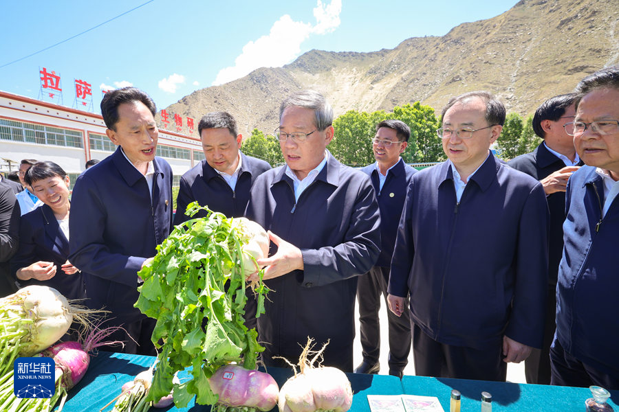 7月18日至19日,中共中央政治局常委、国务院总理李强在西藏调研。这是7月19日在拉萨,李强来到曲水才纳国家现代农业示范区,听取自治区农牧业产业发展、高原生物研究所建设等介绍,观看示范区自产果蔬、高原特色食饮品、民族手工艺品等展示。