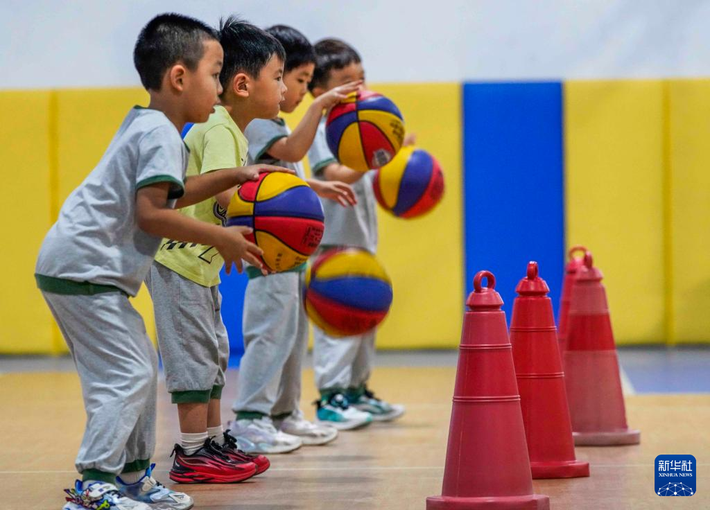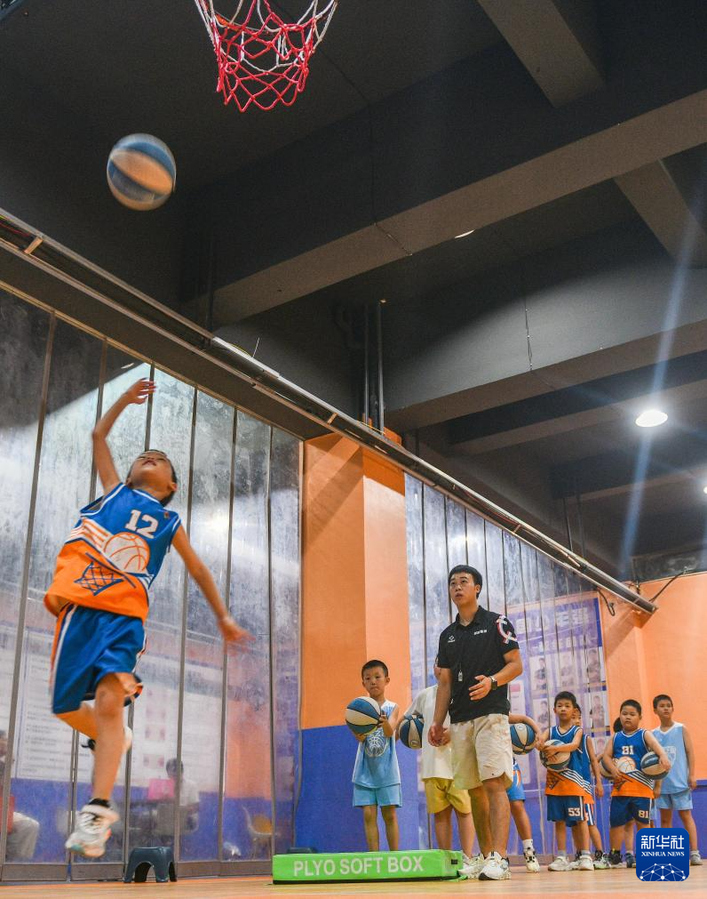 7月19日,孩子们在湖南省永州市道县一家体育培训机构参加篮球训练。