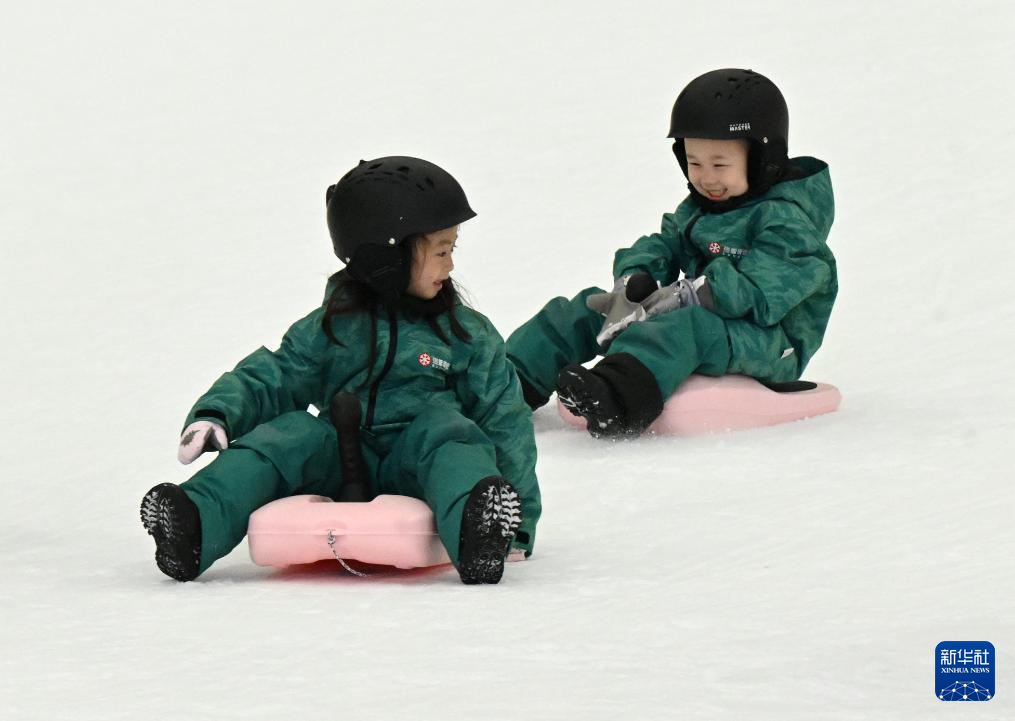 7月19日,小朋友在河北省石家庄市正定县一家雪场体验冰雪运动。