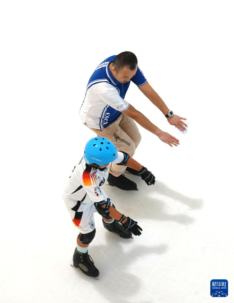 7月19日,在广西南宁市一家室内滑冰场,一名小男孩跟随教练学习滑冰。