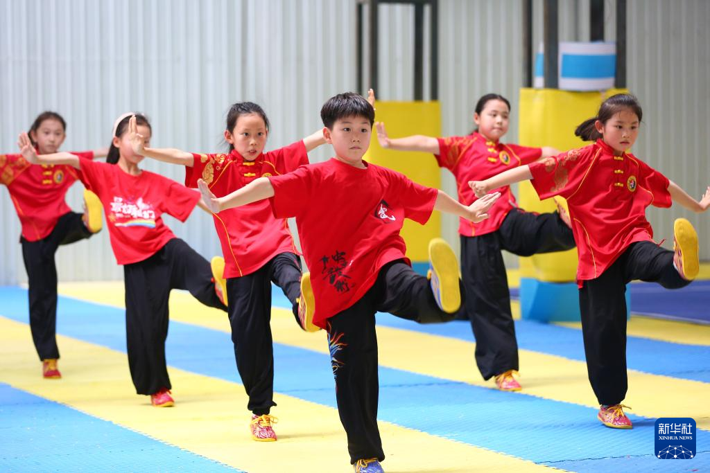 7月19日,孩子们在山东省滕州市一家武术培训机构学习武术。