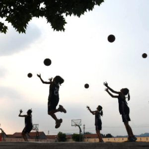7月18日,在山东省淄博市沂源县悦庄镇中心小学体育场,校篮球社团的小队员们在进行抛接球训练。