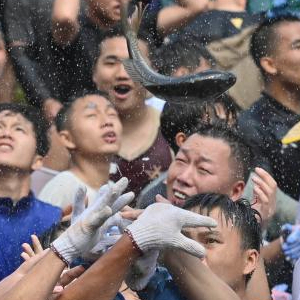 在融水苗族自治县红水乡良双村闹鱼节活动中,村民和游客在河里抓鱼(7月10日摄)。