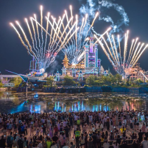 7月19日,在湖北省襄阳市华侨城奇幻谷,游客观看大型夜间演艺秀《奇幻城堡光影秀》(无人机照片)。
