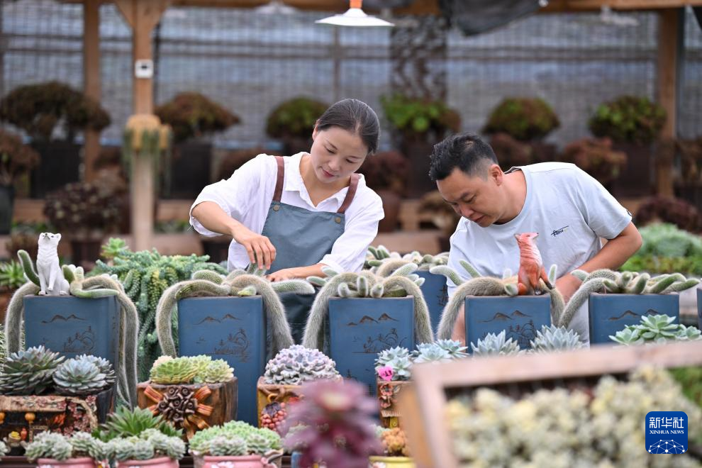 7月19日,在周宁静宇园艺有限公司多肉种植大棚,刘林(左)与丈夫张云昌共同打理多肉盆栽。