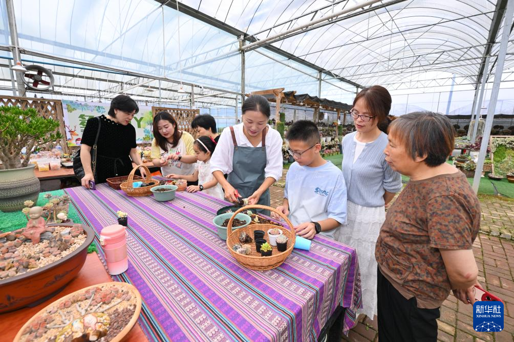 7月19日,在周宁静宇园艺有限公司多肉种植大棚,刘林(右四)指导小朋友制作创意多肉盆栽。