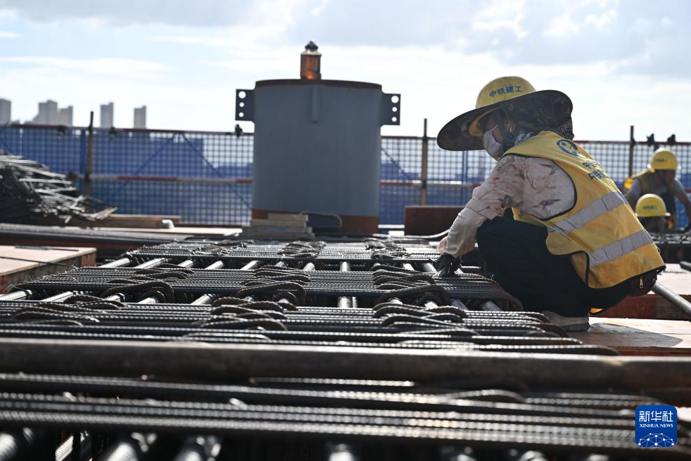 7月21日,中铁建工工人在施工现场绑扎钢筋。