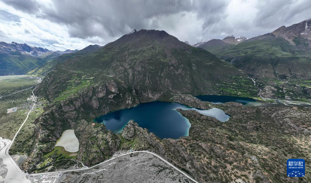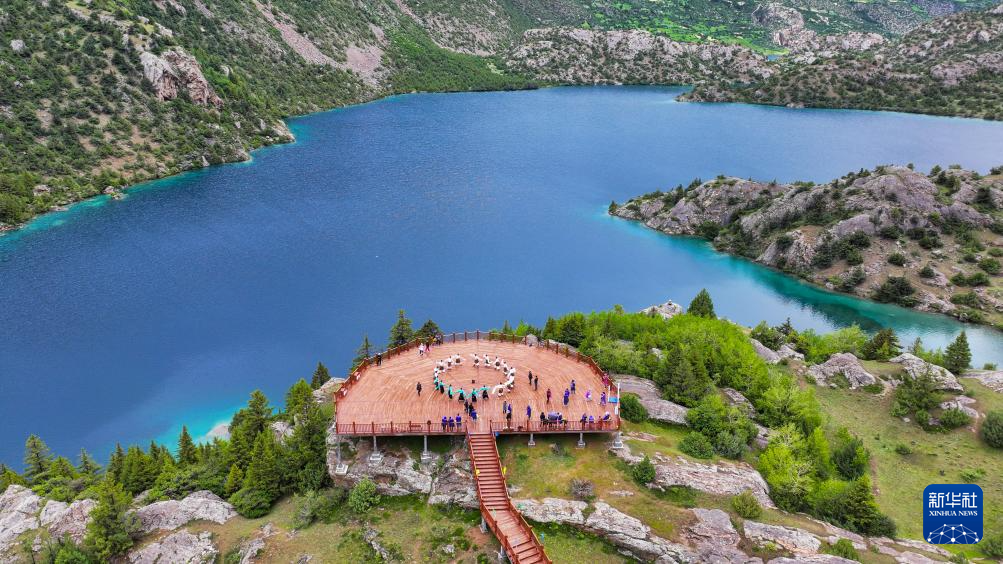 边坝县普玉一村的文艺队演员在“三色湖”观景台上为游客表演锅庄(7月20日摄,无人机照片)。