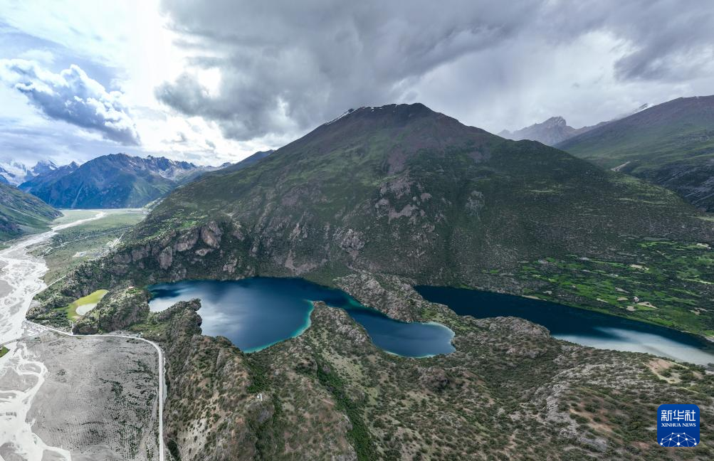 空中俯瞰“三色湖”,从左到右分别为黄湖、黑湖和白湖(7月20日摄,无人机照片)。