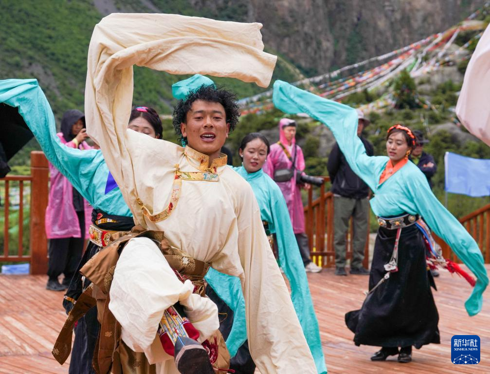 边坝县普玉一村的文艺队演员在“三色湖”观景台上为游客表演锅庄(7月20日摄)。