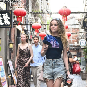 7月21日,俄罗斯游客索尼娅·布里亚克(右)行走在上海市田子坊。