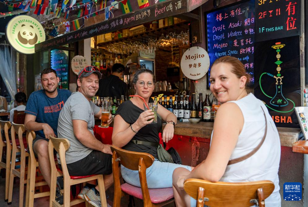 7月21日,奥地利游客在上海市田子坊内一家酒吧品尝饮品。
