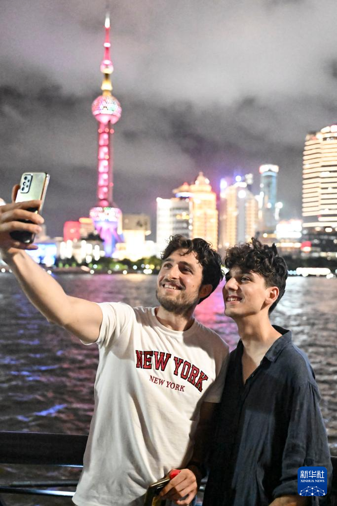 7月18日晚,意大利游客阿尔弗雷多·奇米诺(左)和朱利奥·巴尔托利在上海外滩与东方明珠合影。“有了免签政策,我们来中国很方便。这里购物方便、景色优美、人民也很友善,我希望我的家人朋友都能亲自来看看。”意大利游客朱利奥·巴尔托利说。