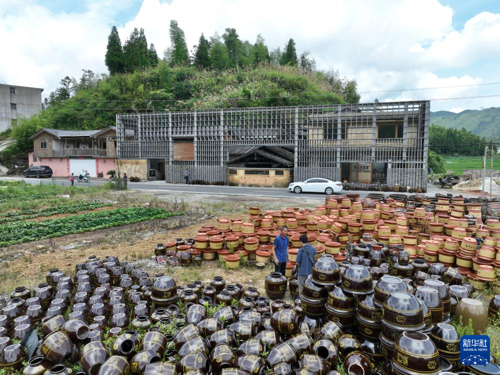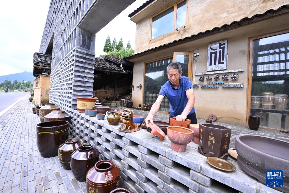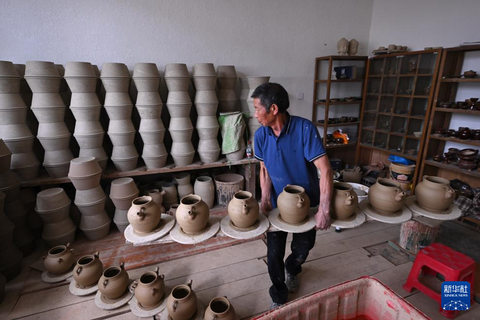 7月18日,在周宁县浦源镇萌源村月山古龙窑,肖家涨摆放展示用的传统硋器。