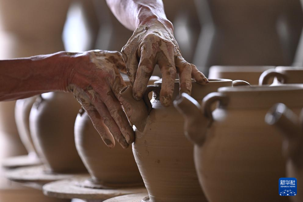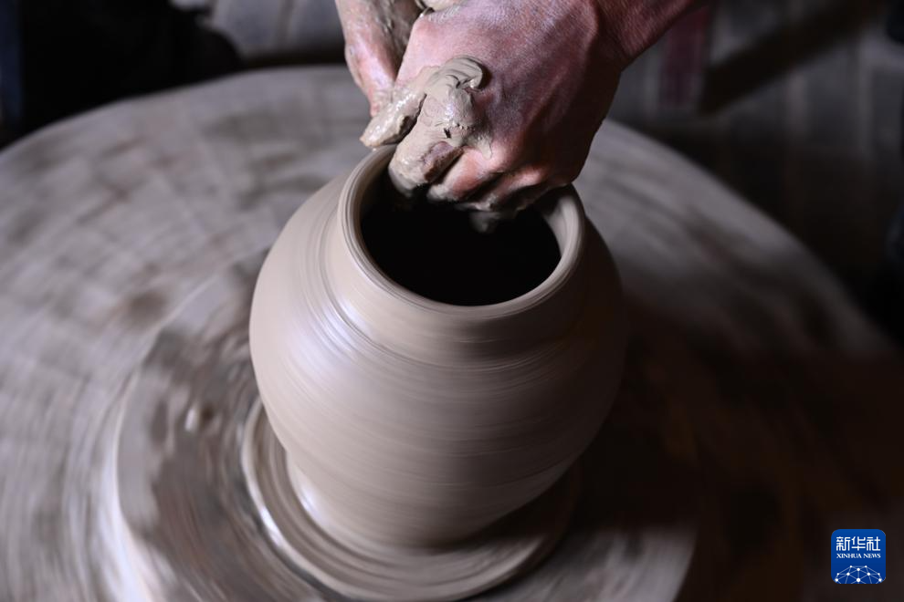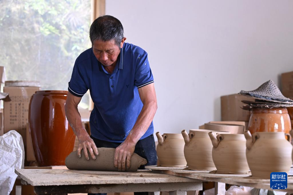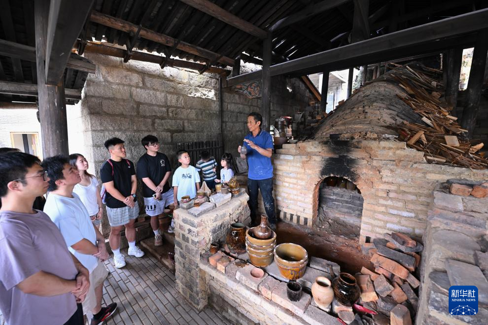 在福建省周宁县浦源镇萌源村月山古龙窑,萌源制硋世家第七代传人、年过七旬的肖家涨一边忙着制坯,一边向前来参观的游客讲解制硋工艺。