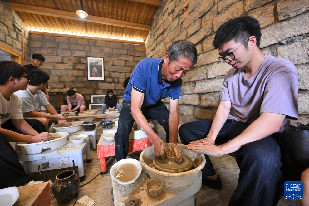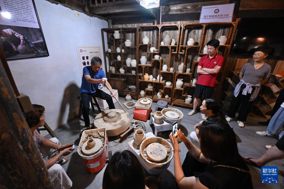 7月18日,在周宁县浦源镇萌源村月山古龙窑制作间,肖家涨(左)在向前来参观研学的华侨大学学生演示拉坯制硋技艺。