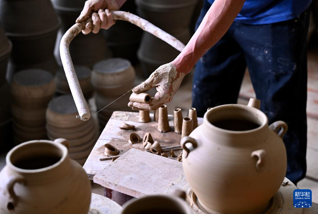 7月18日,在周宁县浦源镇萌源村月山古龙窑制作间,肖家涨在制作传统硋器。