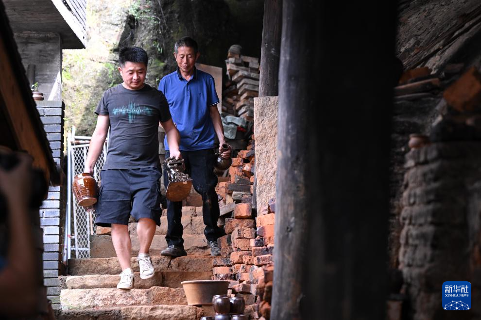 7月18日,在周宁县浦源镇萌源村月山古龙窑,肖家涨(左)与儿子肖永灿从龙窑内取成品硋器。
