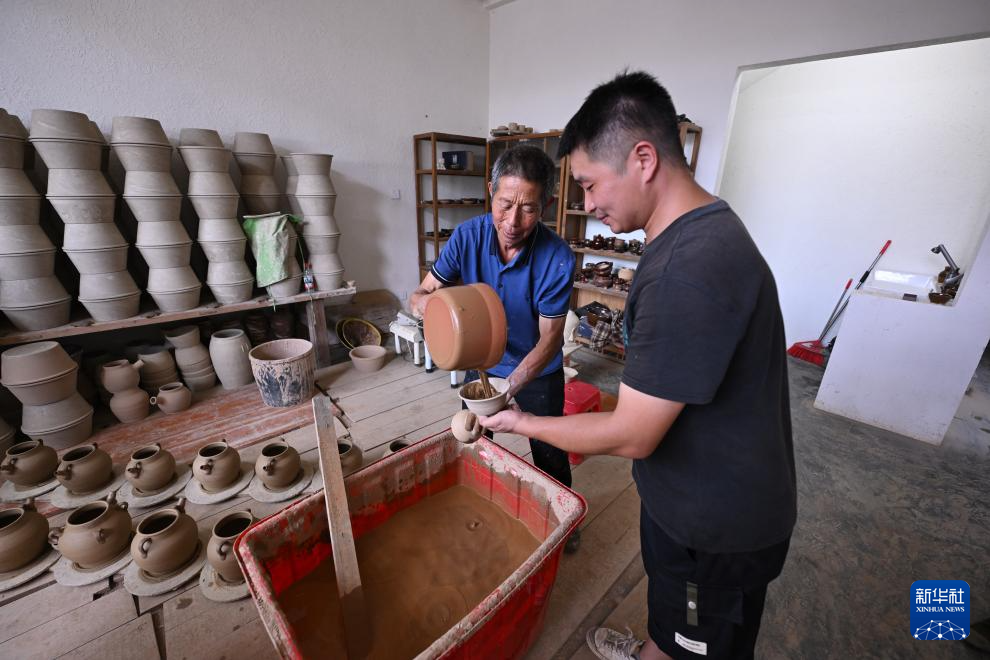 7月18日,在周宁县浦源镇萌源村月山古龙窑制作间,肖家涨(左)与儿子肖永灿在为坯体上釉。