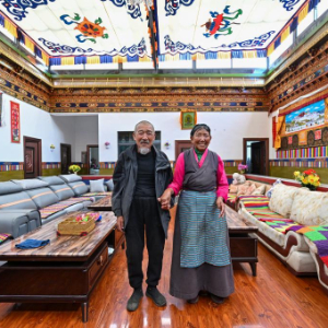 7月21日,拉丁雪村74岁的扎西欧珠(左)和73岁的老伴索朗玉珍站在自家新房的客厅里合影。