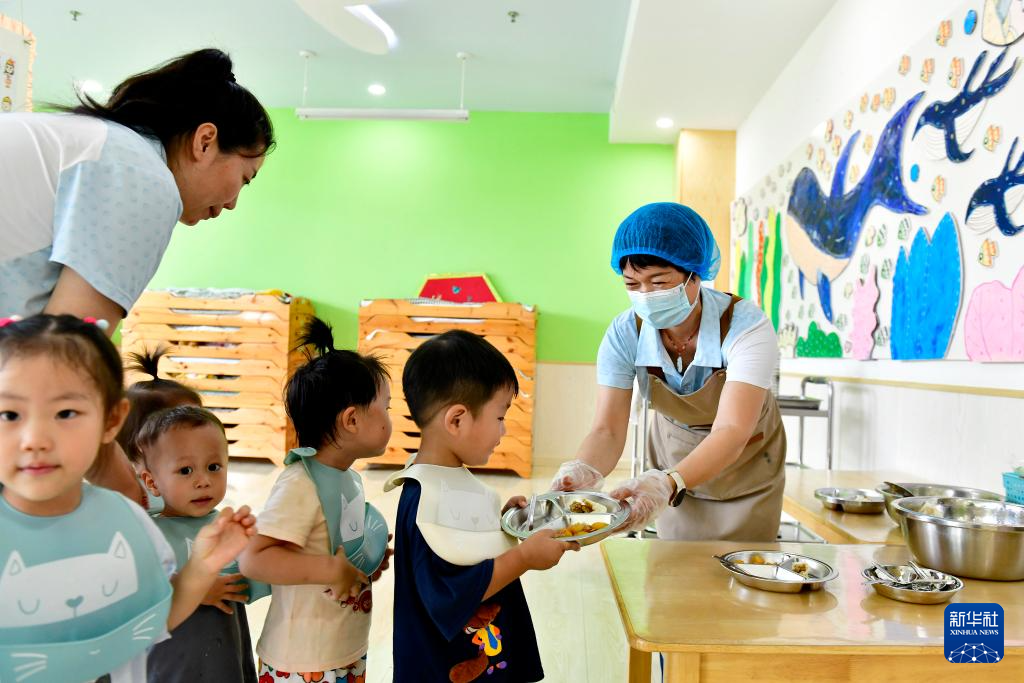 7月22日,在博兴县金色摇篮幼儿园,托育班的孩子在排队领餐。