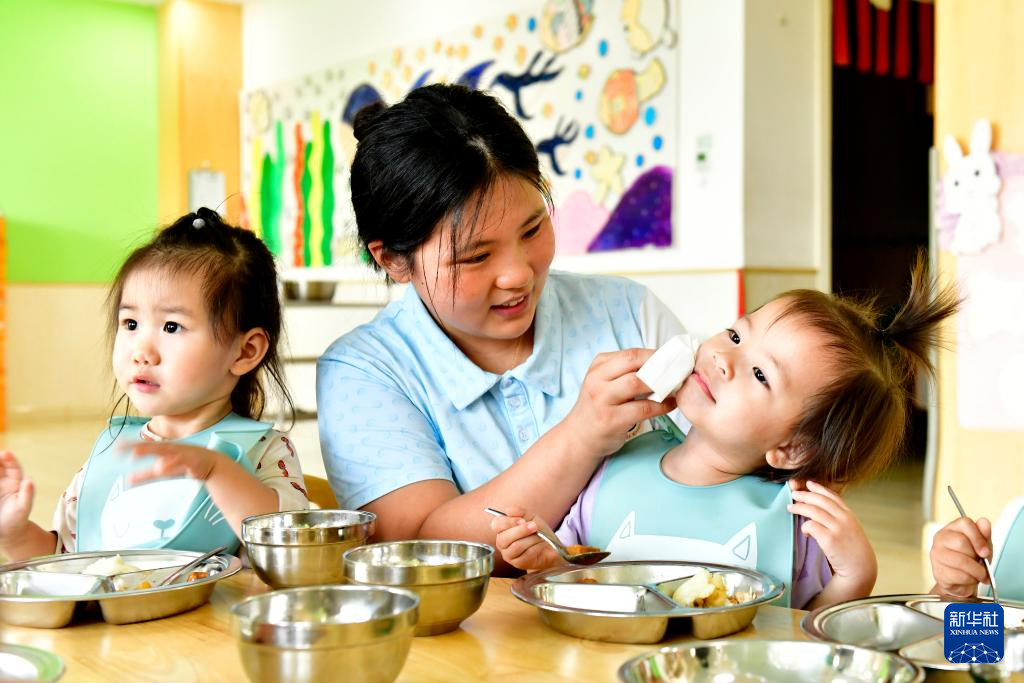 7月22日,在博兴县金色摇篮幼儿园,老师在帮托育班的孩子擦嘴。