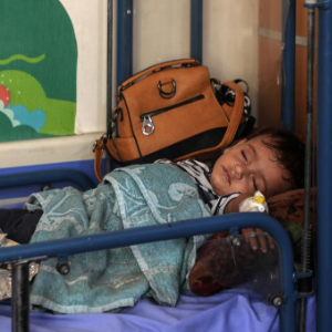 7月23日,在加沙城一所医院里,两名女子陪伴一名营养不良的儿童。