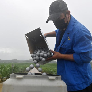 7月23日,在位于广西上思县的昌菱农场蔗区,技术人员在将螟黄赤眼蜂球倒入无人机。
