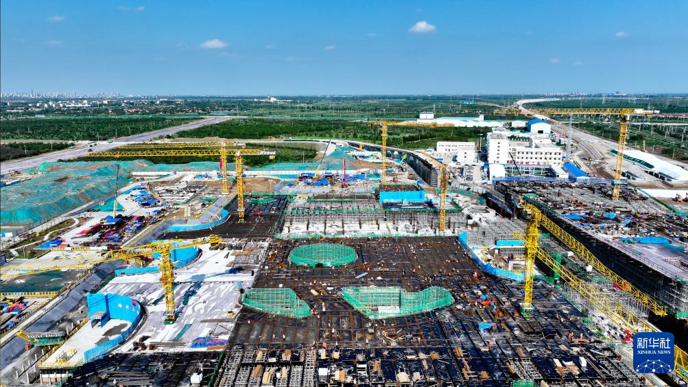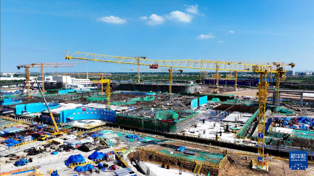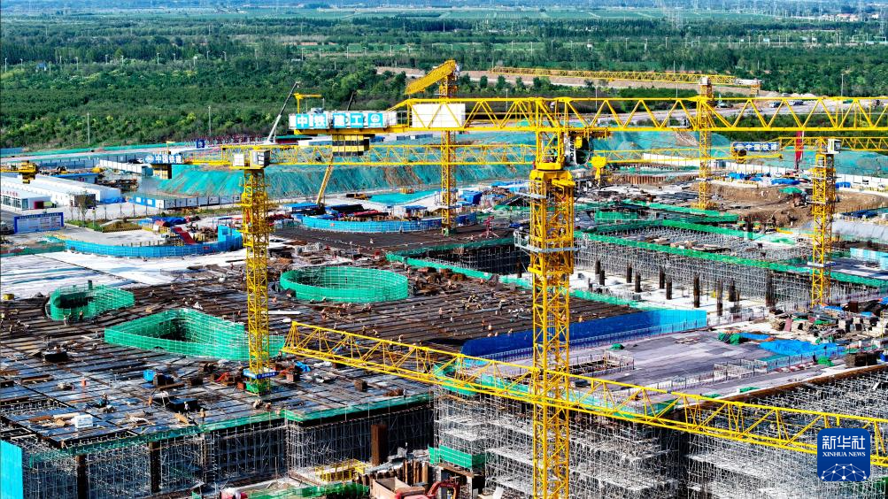 7月25日,在津潍高铁山东东营高铁站现代综合客运枢纽及配套工程建设现场,中铁二十局工作人员在施工(无人机照片)。