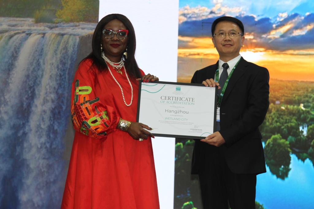 7月24日,在津巴布韦维多利亚瀑布城开幕的《湿地公约》第十五届缔约方大会上,《湿地公约》秘书长穆松达·蒙巴为中国浙江杭州代表颁发“国际湿地城市”证书。