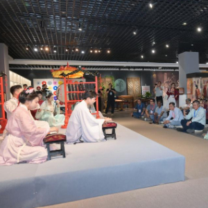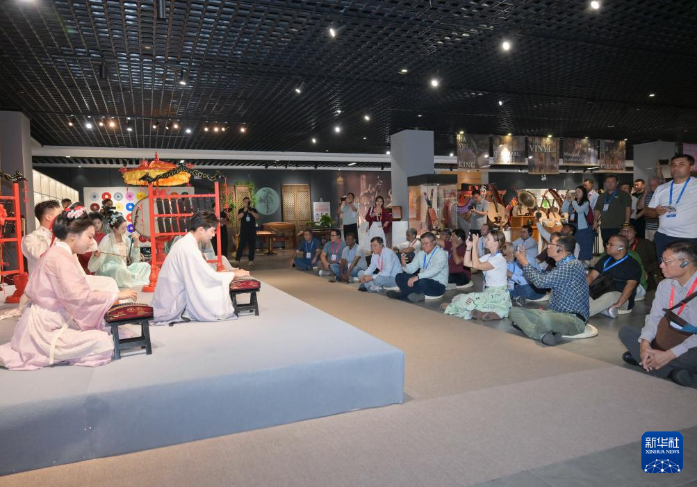 7月26日,上海合作组织媒体智库峰会与会嘉宾在中国(河南)自贸区国际艺术品保税仓观看民族乐器演奏。