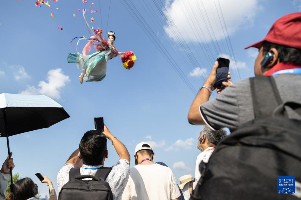 7月26日,上海合作组织媒体智库峰会与会嘉宾在开封清明上河园拍摄“大宋飞天秀”。