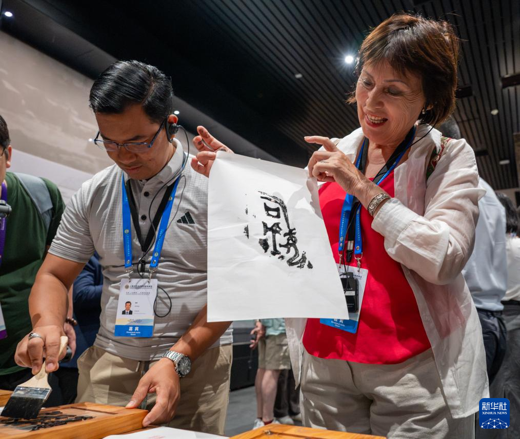 7月26日,上海合作组织媒体智库峰会与会嘉宾在安阳市殷墟博物馆新馆体验拓印。
