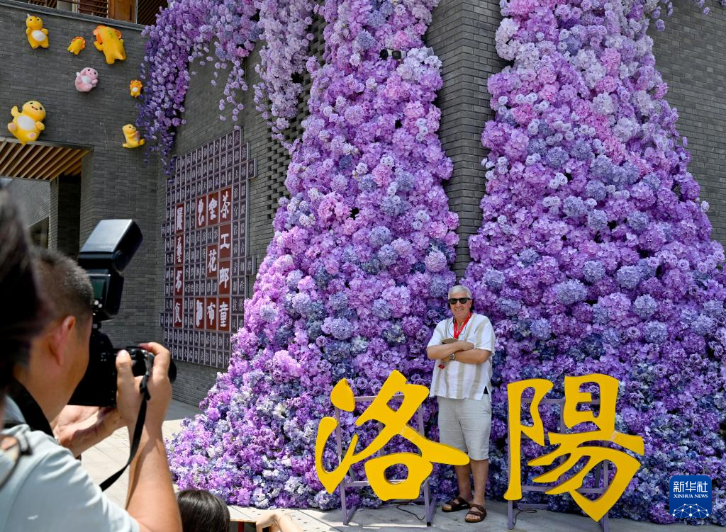 7月26日,上海合作组织媒体智库峰会与会嘉宾在洛阳市洛龙区一街道旁拍照留念。