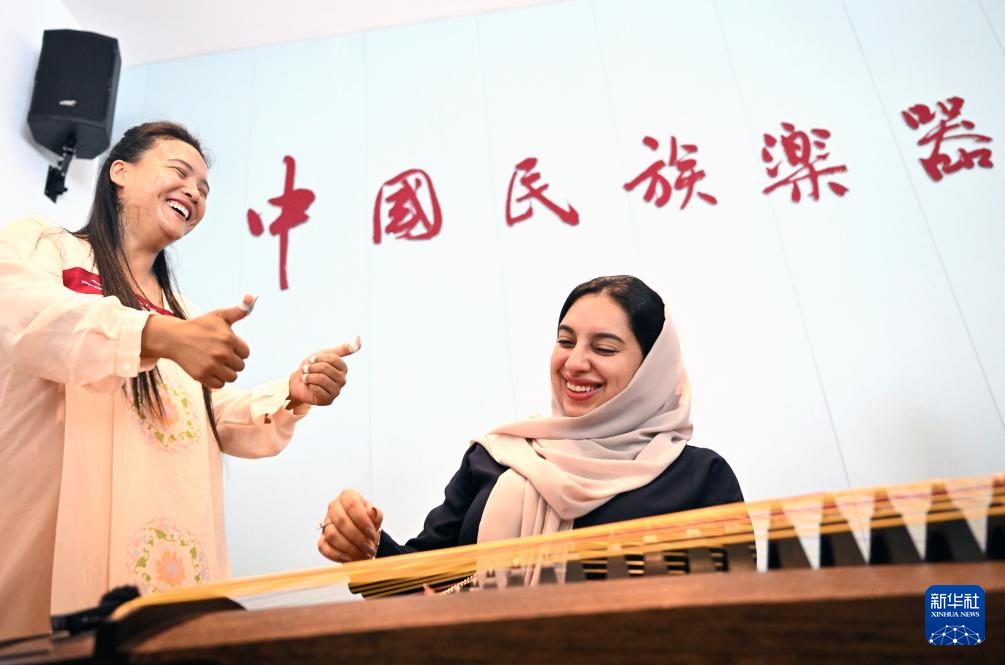 7月26日,上海合作组织媒体智库峰会与会嘉宾在兰考县音乐小镇学习弹奏中国民族乐器。
