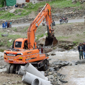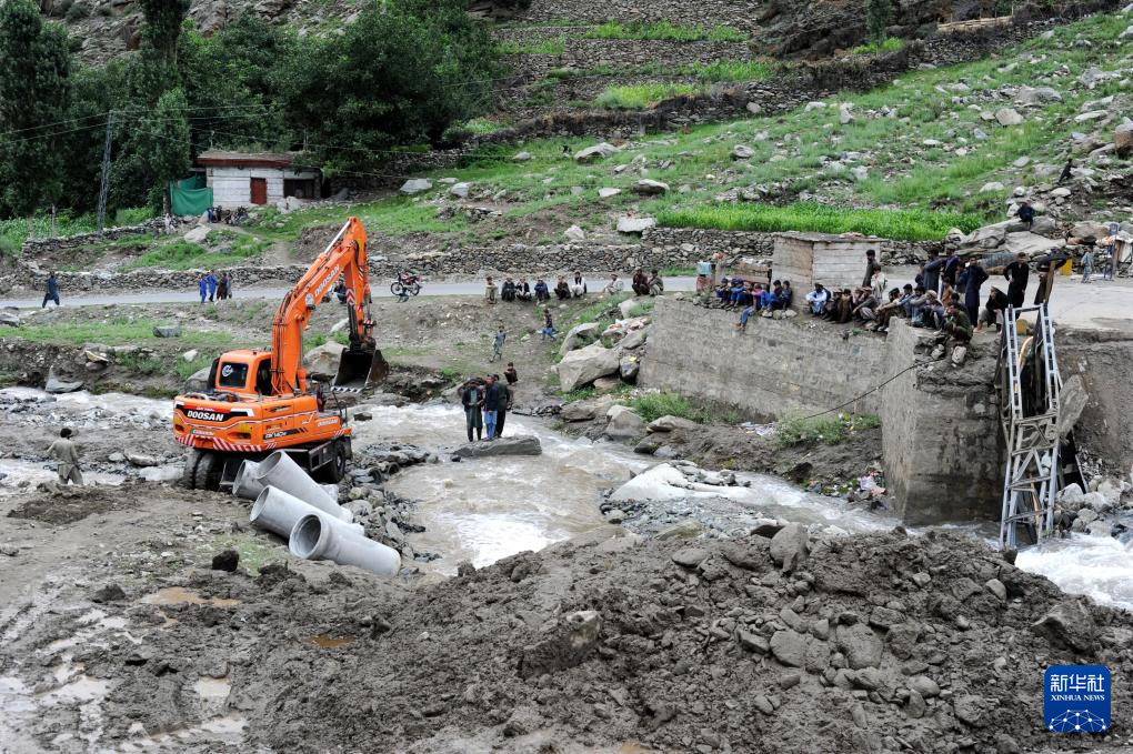 7月24日,在巴基斯坦北部吉尔吉特-伯尔蒂斯坦地区的齐拉斯附近,救援人员清理受暴雨洪水影响的道路。