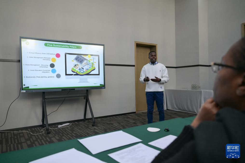 7月25日,在肯尼亚首都内罗毕,肯尼亚参赛选手费利克斯进行项目答辩。