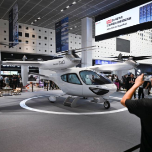 这是7月26日在2025世界人工智能大会拍摄的时的科技电动垂直起降飞行器。据工作人员介绍,该产品具备智能驾驶功能。