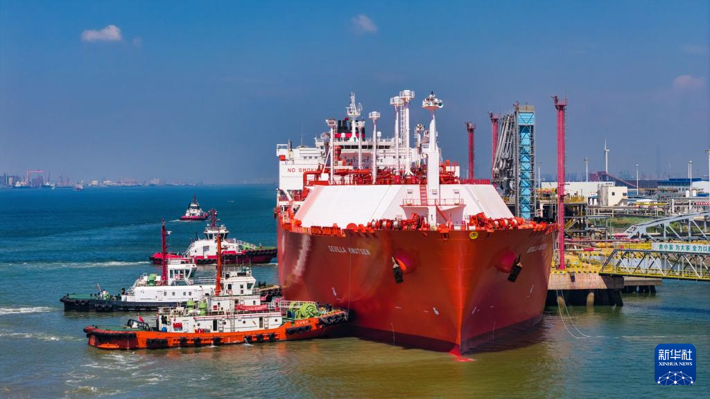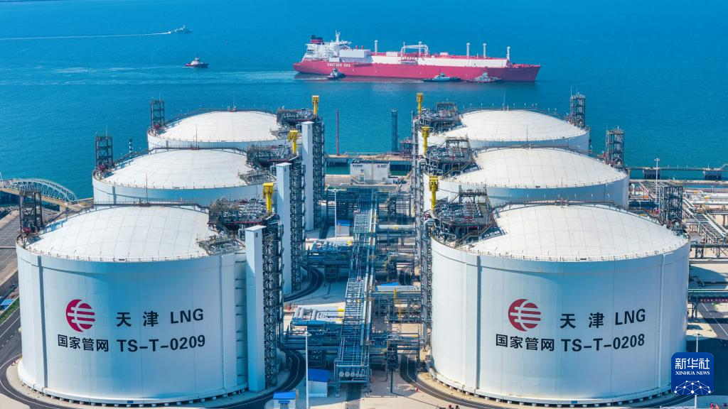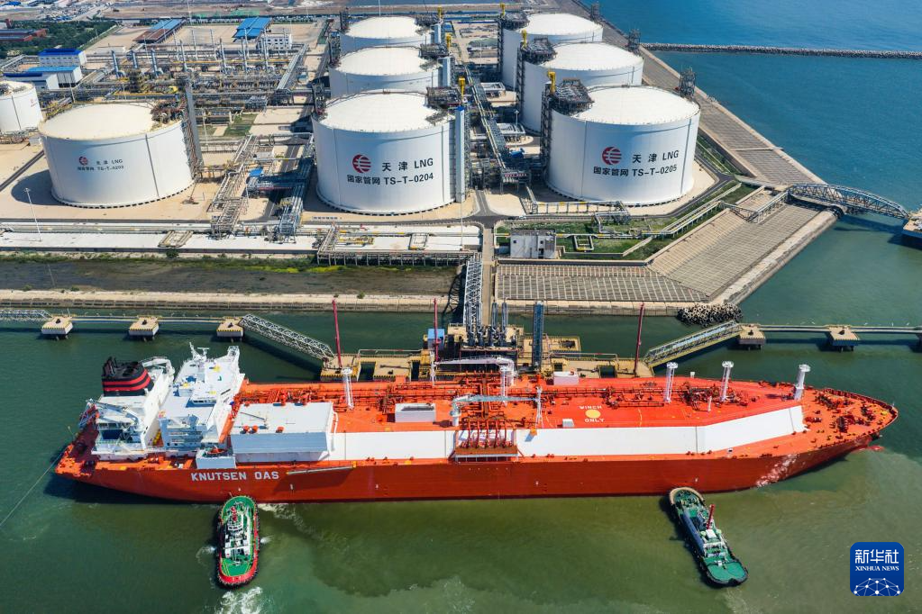 7月27日,一艘来自海外的LNG船舶在国家管网天津LNG接收站码头靠泊(无人机照片)。