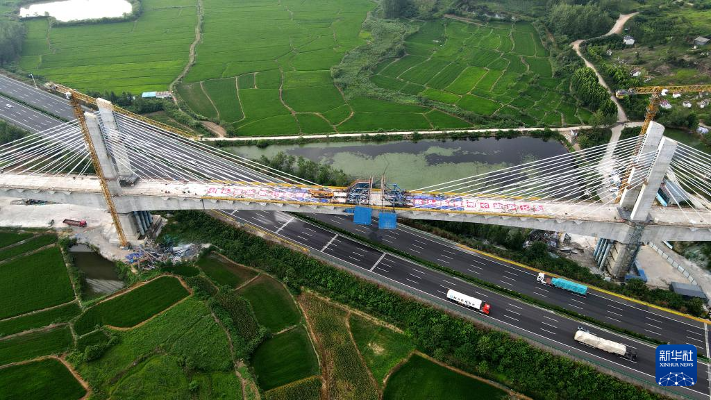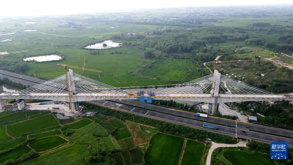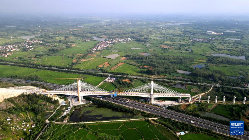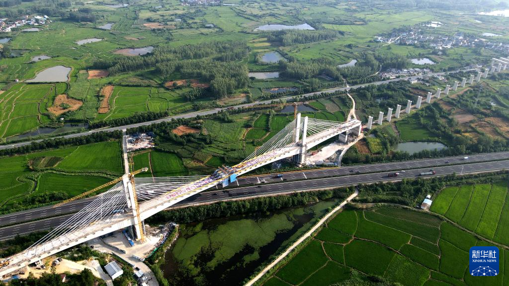 新建沪宁合高铁安徽段跨沪陕高速公路特大桥完成合龙(7月28日摄,无人机照片)。