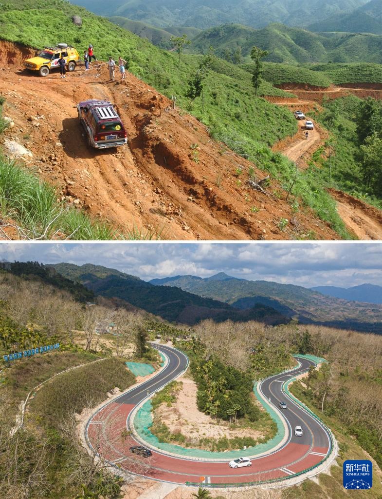 这是一张拼版照片。上图:海南省汽车越野运动协会组织越野车队从海南陵水黎族自治县出发,历时2天,在热带雨林中穿行150多公里,经海南保亭县、五指山市,由东向西成功穿越了五指山山脉(2004年5月30日摄,新华社记者姜恩宇摄);下图:车辆行驶在环热带雨林国家公园旅游公路保亭段(2025年1月30日摄,新华社记者蒲晓旭摄)。