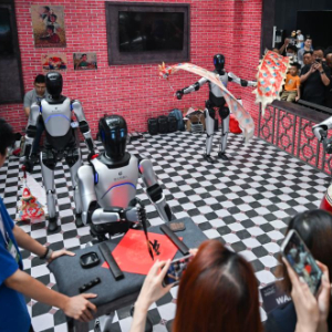 7月29日,智元机器人在进行“才艺”展示,吸引参观者驻足观看。